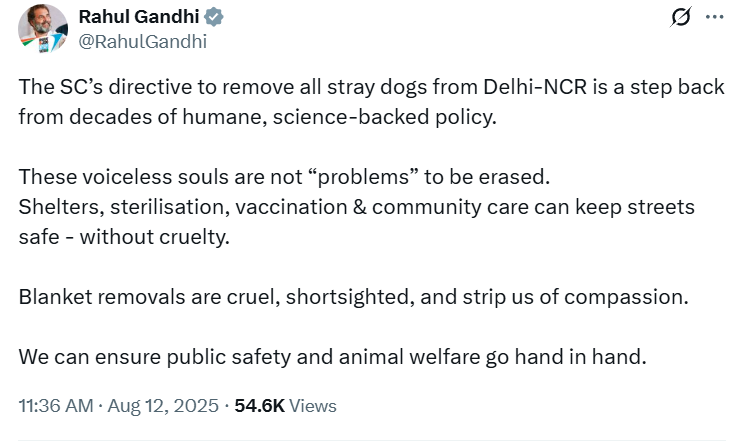 राहुल की यह टिप्पणी सुप्रीम कोर्ट की ओर से दिल्ली-एनसीआर के अधिकारियों को जल्द से जल्द सभी आवारा कुत्तों को सड़कों से स्थायी रूप से आश्रय स्थलों में स्थानांतरित करने का निर्देश देने के एक दिन बाद आई। शीर्ष अदालत ने कहा था कि आवारा कुत्तों के काटने से रेबीज होने की वजह से स्थिति बेहद गंभीर हो गई है। खासकर छोटे बच्चे इससे सबसे ज्यादा प्रभावित हैं। कोर्ट ने यह भी कहा कि समय के साथ कुत्तों के आश्रयों की संख्या बढ़ानी होगी। इसके साथ ही शीर्ष अदालत ने दिल्ली के अधिकारियों को छह से आठ हफ्तो में लगभग 5,000 कुत्तों के आश्रय स्थल बनाने का निर्देश दिया।