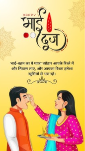 भाई दूज के अवसर पर तिलक लगाने का शुभ मुहूर्त 2 घंटे 15 मिनट है. उस दिन बहनें अपने भाइयों को दोपहर में 1 बजकर 13 मिनट से दोपहर 3 बजकर 28 मिनट के बीच तिलक लगाएं. उसके बाद भाई को भोजन कराकर उसके सुखी जीवन की प्रार्थना करें. भाई भी बहन को उपहार और शुभकामनाएं दें.